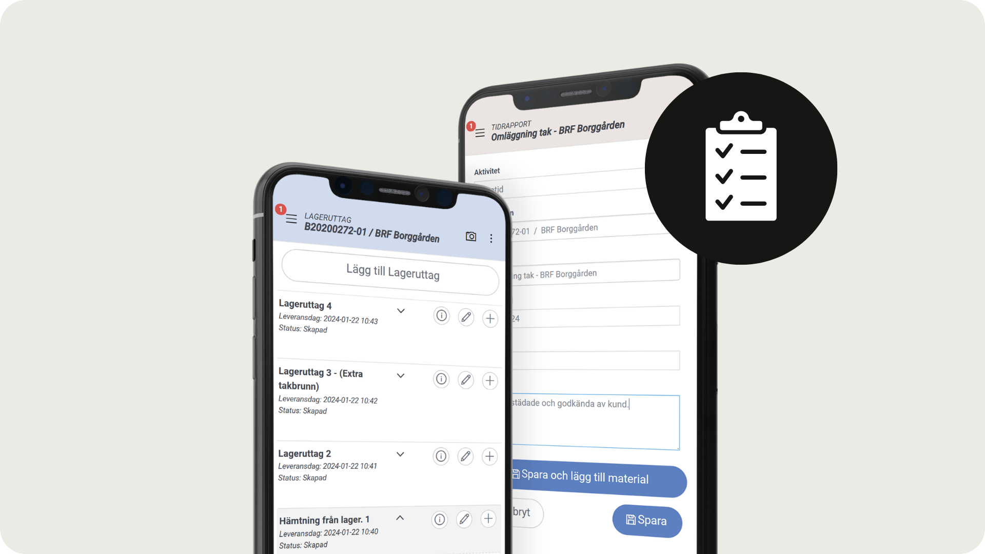 En enkel mobilapplikation för tid- och materialrapportering som inkluderar checklistor för egenkontroller och riskanalyser samt visar projektdokumentation för respektive arbetsorder.