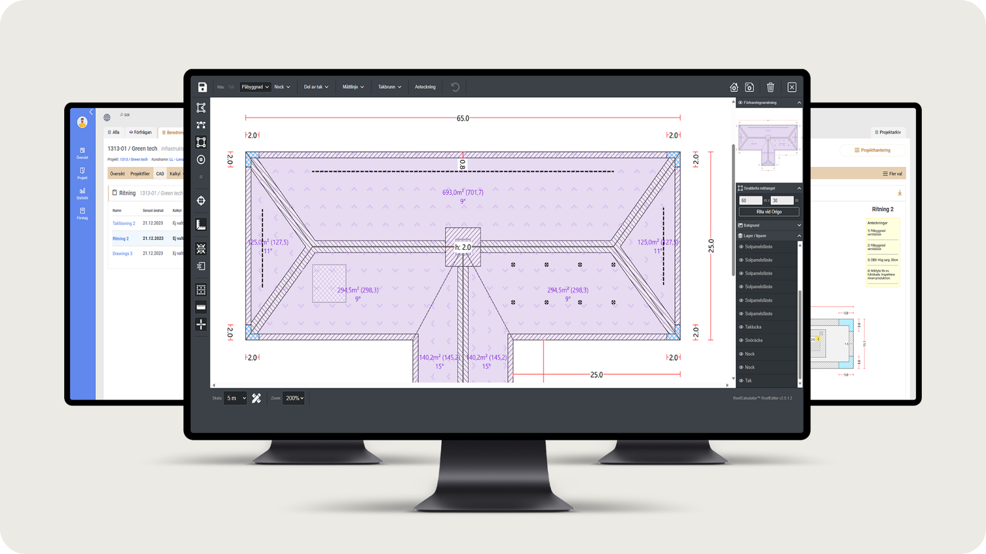 Integrerad CAD modul för att rita upp och mängda projektets takytor. Ladda upp bilder från Google Maps eller PDF ritningar för att snabbt rita upp taket i rätt skala. Rita enkelt detaljer såsom takbrunnar, snörasskydd och takstegar. Markera ytor för exempelvis solceller på taket.