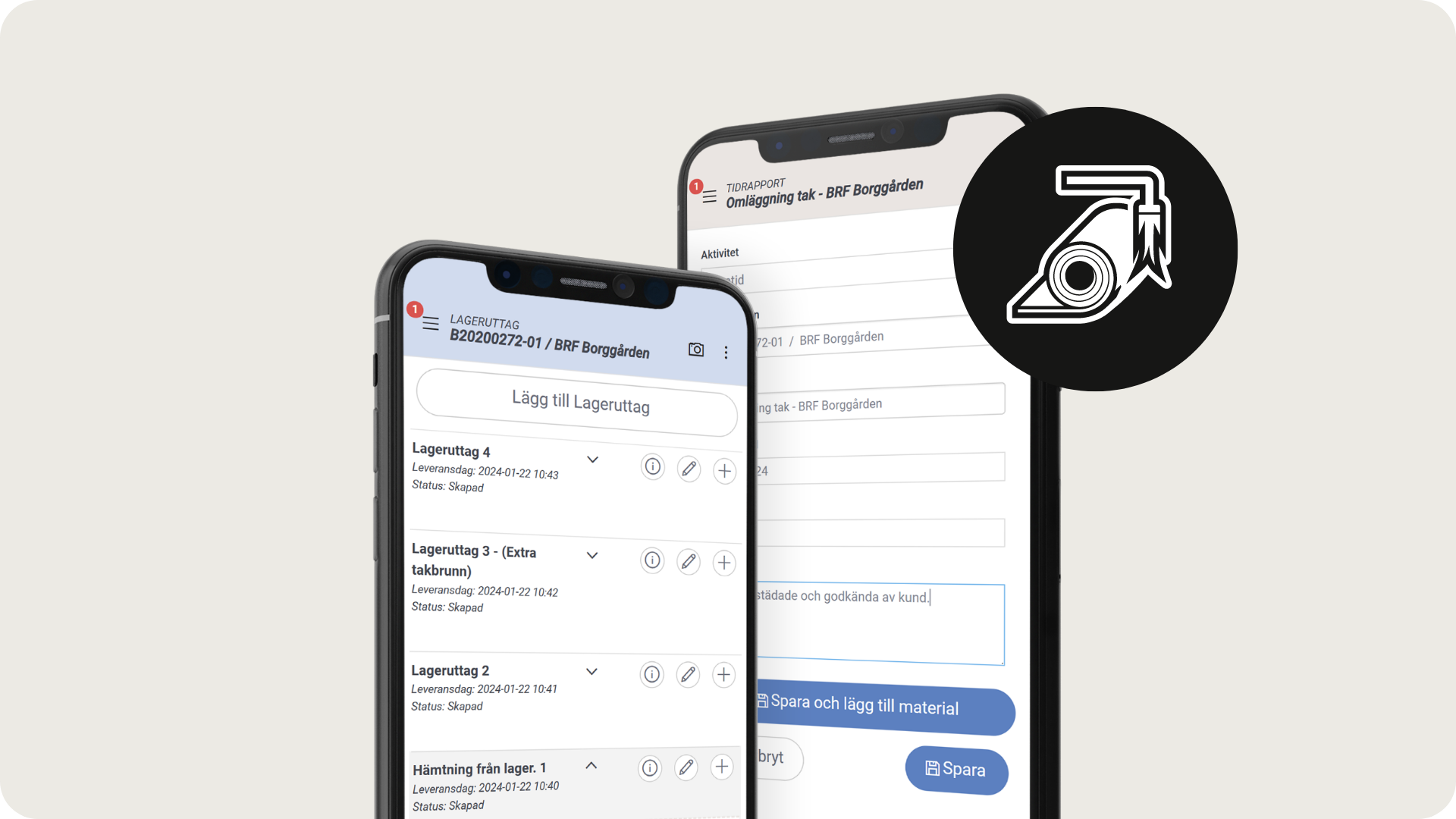 Logga in och ut i projektets personalliggare, fyll i checklistor eller rapportera progress på större jobb. Med arbetsordrar och instruktioner tillgängliga i mobilen görs livet lätt för montören och när arbetsordern är färdigställd blir projektledaren notifierad.